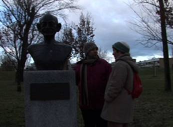 V.J. Približavamo se spomeniku Mahatmi Gandiju. Da li si nekada videla ovaj spomenik?